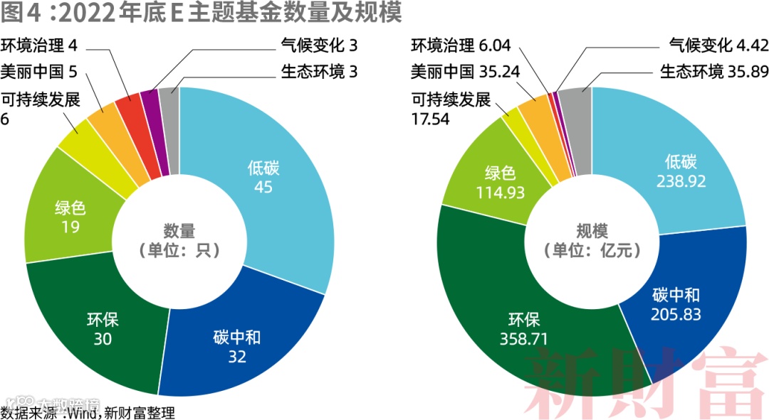 由于气候变化成为全球性挑战,2022年,E领域新增3只气候变化主题基金,与碳相关的主题基金如碳中和、低碳等,数量占比超过一半,规模占比接近一半(图4)。