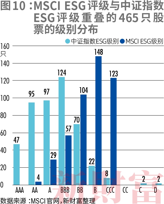 将MSCI与中证指数重叠的465只股票的级别分布情况进行对比,可以发现,MSCI的ESG级别整体低于中证指数2个子级左右,如MSCI的AA和A级映射到中证指数的评价体系中大约是AAA级别,另外,MSCI的ESG级别集中在B级,中证指数则集中在BBB级(图10)。