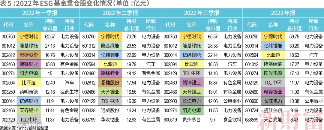 十大重仓股中,阳光电源、天齐锂业有3个季度出现,恩捷股份、长江电力2个季度出现,药明康德、通威股份、华友钴业、天合光能、捷佳伟创及贵州茅台各出现一次。值得注意的是,贵州茅台于2021年三季报跌出十大重仓股,一年后又再次出现,而2022年茅台也发布了其首份ESG报告(表5)。