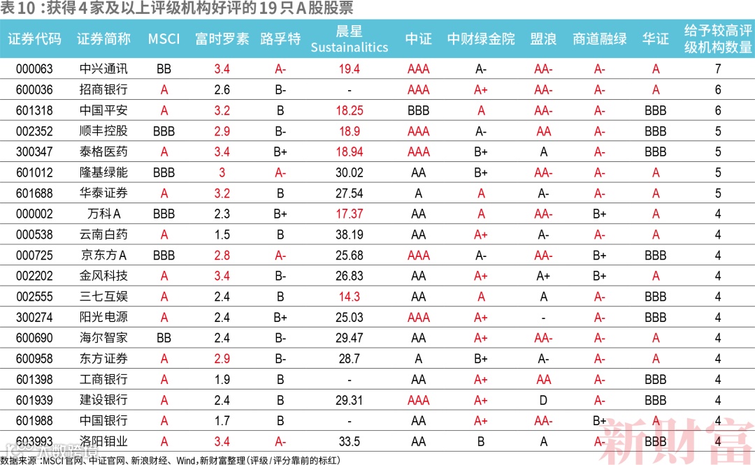 新财富整理MSCI、富时罗素、路孚特(Refinitiv)、晨星旗下的Sustainalytics、中证、中财绿金院、盟浪、商道融绿、华证9家ESG评级机构的评级结果,发现4家及以上机构给予较高评级/评分(排在前10%左右)的股票共计19只。其中,7家评级机构给予中兴通讯较高级别;6家给予招商银行、中国平安较高级别;5家给予顺丰控股、泰格医药、隆基绿能、华泰证券较高级别;4家给予较高级别的股票数量共计12只。