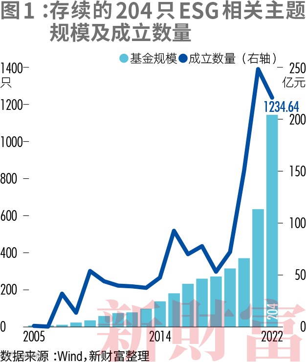 从基金数量看,新财富统计显示,截至2022年底,国内共有204只存续的ESG相关主题的公募基金(图1),较2021年底新增85只,数量增长71.43%。不过,受A股市场低迷影响,ESG公募基金的资产规模同比下降12.82%,为1234.64亿元。