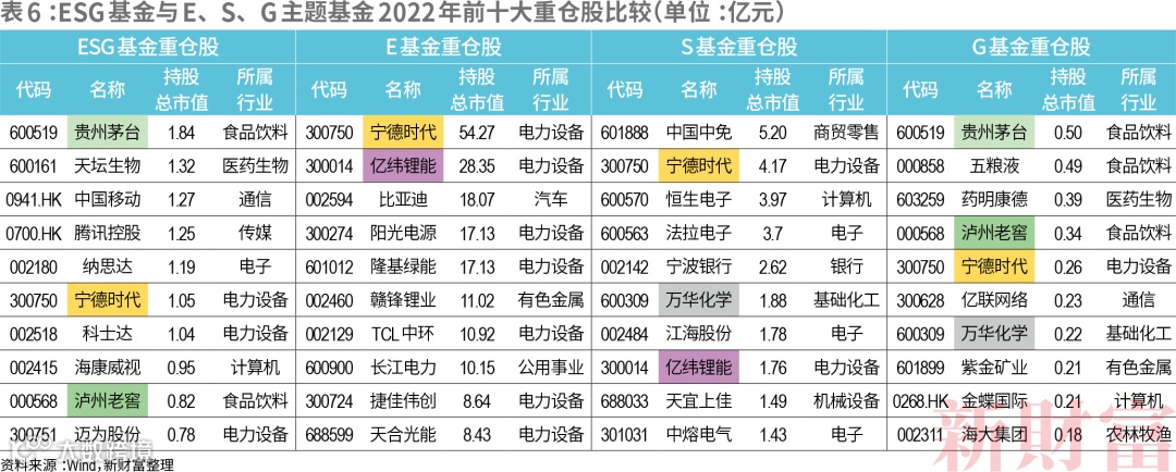 将ESG基金与E、S、G三个子领域主题基金的重仓股进行比较,可以发现,其差异较大,重复出现的仅有5只股票,而2021年底这一数据为6只(表6)。其中,宁德时代是唯一同时出现的标的,贵州茅台、泸州老窖出现在ESG、G基金重仓股中,亿纬锂能出现在E、S基金重仓股中,万华化学出现在S、G基金重仓股中。