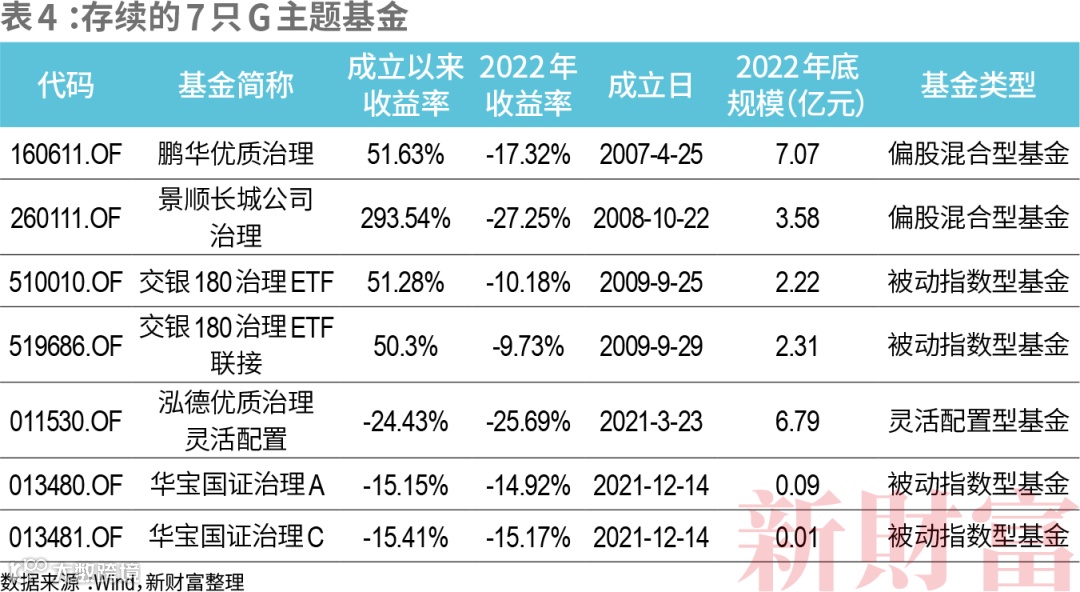 从成立以来收益率看,最高的为2008年成立的景顺长城公司治理,收益率为318.28%,另外3只成立于2007-2009年间的G主题基金,收益率也位于60%左右,但成立于2021年的3只基金收益率均为负值。