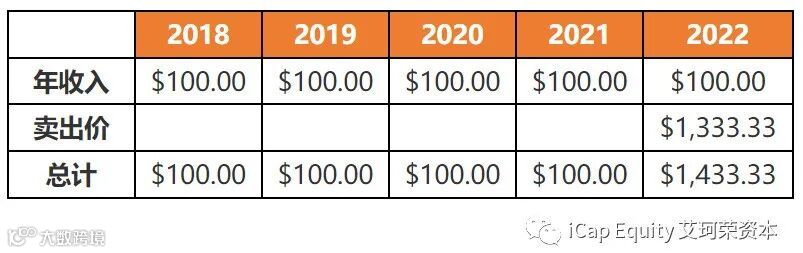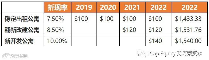 在以下示例中,我们将分析稳定出租公寓与酒店带来的现金流。预计这两种资产每年都能产生100美元的现金流,并假设未来出售时计算剩余价值使用的资本化率等于其折现率。在没有增长的情况下,折现率和资本化率基本上相等。