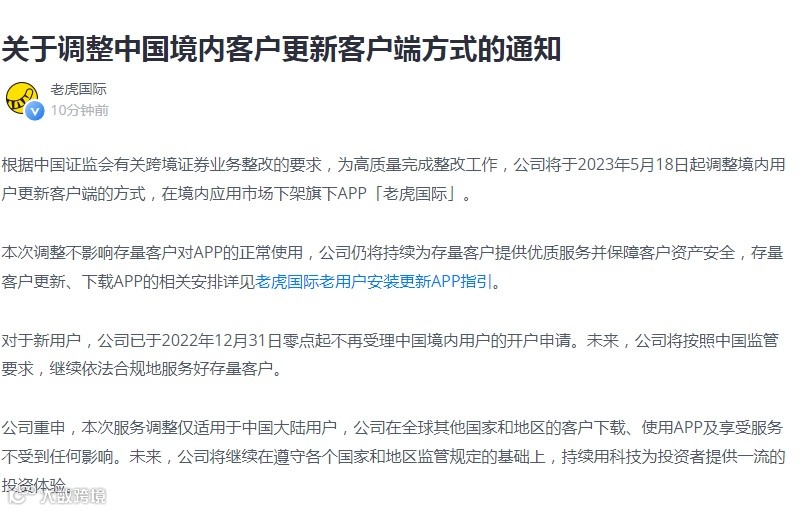 老虎证券则表示,将于2023年5月18日起,调整境内用户更新客户端的方式,在境内应用市场下架旗下APP“老虎国际”。“本次调整不影响存量客户对APP的正常使用,公司仍将持续为存量客户提供优质服务并保障客户资产安全。”
