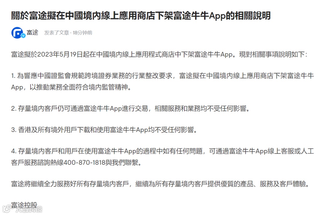 “富途将继续全力服务好所有存量境内客户,继续为所有存量境内客户提供优质的产品、服务及客户体验。”