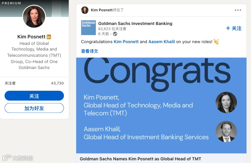 近日,高盛一份内部备忘录显示,集团已任命Kim Posnett为TMT投资银行集团的全球负责人。与此同时,她还将继续担任One Goldman Sachs计划的联席主管。随后高盛投资银行通过LinkedIn转发了此消息,并得到了当事人Kim Posnett的评论,“感谢大家的支持,很高兴回到TMT并领导这支队伍。”