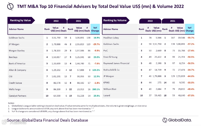 根据数据和分析公司 GlobalData发布的2022年TMT行业十大并购投行榜,高盛一骑绝尘——参与交易总值达到3518亿美元(超2万亿元人民币),位居榜首。GlobalData首席分析师表示:“高盛在2022年成功地为260亿美元的交易提供了建议,其中11宗是价值超过100亿美元的大型交易。这有助于它在价值方面始终遥遥领先于同行。它也是2022年为超过50笔交易提供咨询的仅有的三家公司之一。因此,它也成功地占据了交易量第二的位置。”