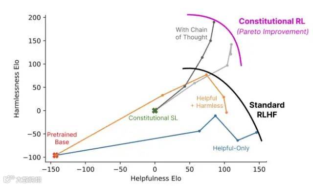 Claude 和 ChatGPT 都依赖于强化学习(RL)来训练偏好(preference)模型。CAI(Constitutional AI)也是建立在RLHF的基础之上,不同之处在于,CAI的排序过程使用模型(而非人类)对所有生成的输出结果提供一个初始排序结果。