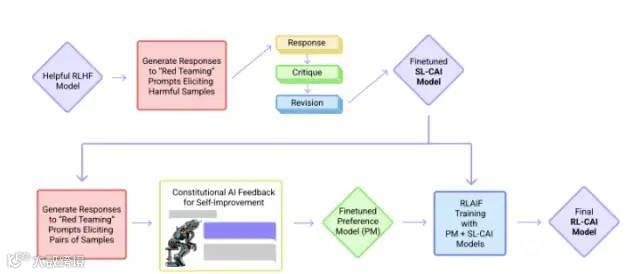 CAI用人工智能反馈来代替人类对表达无害性的偏好,即RLAIF,人工智能根据一套constitution原则来评价回复内容。