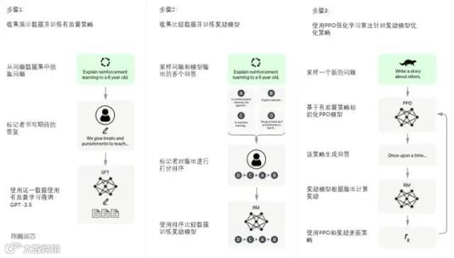 InstructGPT/GPT3.5(ChatGPT的前身)与GPT-3的主要区别在于,新加入了被称为RLHF(Reinforcement Learning from Human Feedback,人类反馈强化学习)。这一训练范式增强了人类对模型输出结果的调节,并且对结果进行了更具理解性的排序。