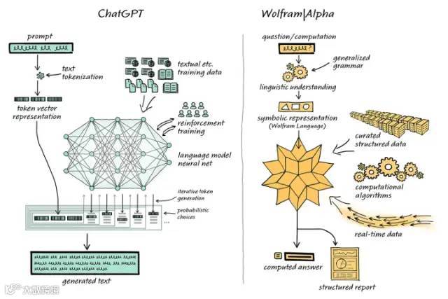 在这一结合体系中,ChatGPT 可以像人类使用 Wolfram|Alpha 一样,与 Wolfram|Alpha “对话”,Wolfram|Alpha 则会用其符号翻译能力将从 ChatGPT 获得的自然语言表达“翻译”为对应的符号化计算语言。在过去,学术界在 ChatGPT 使用的这类 “统计方法” 和 Wolfram|Alpha 的 “符号方法” 上一直存在路线分歧。但如今 ChatGPT 和 Wolfram|Alpha 的互补,给NLP领域提供了更上一层楼的可能。