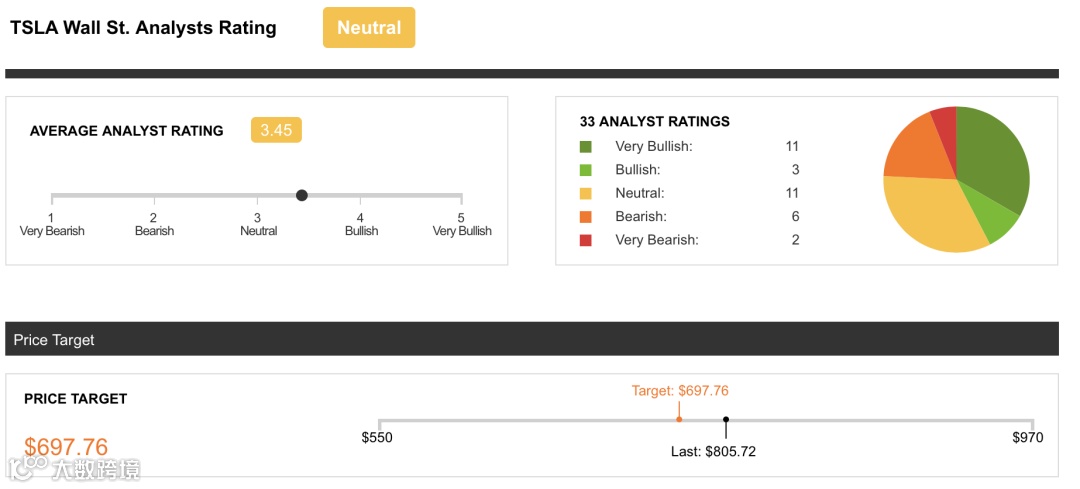 根据Seeking Alpha数据,目前共33位华尔街分析师对特斯拉给出评级,其中14人看多,8人看空。从历史平均目标价来看,华尔街给予特斯拉的目标价一直在不断攀升,近期达到了697.76美元的新高点。但即便如此,特斯拉实际表现仍远超华尔街预期,经历了大半年的回落与调整后,特斯拉股价又站上800美元。