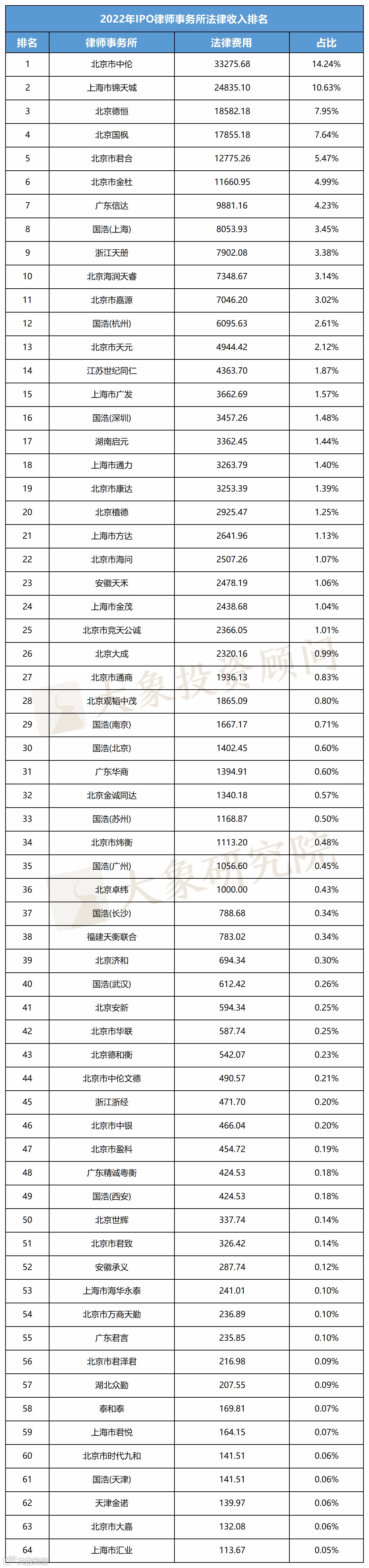据统计,2022年共有64家律师事务所为IPO上市企业提供了法律服务。