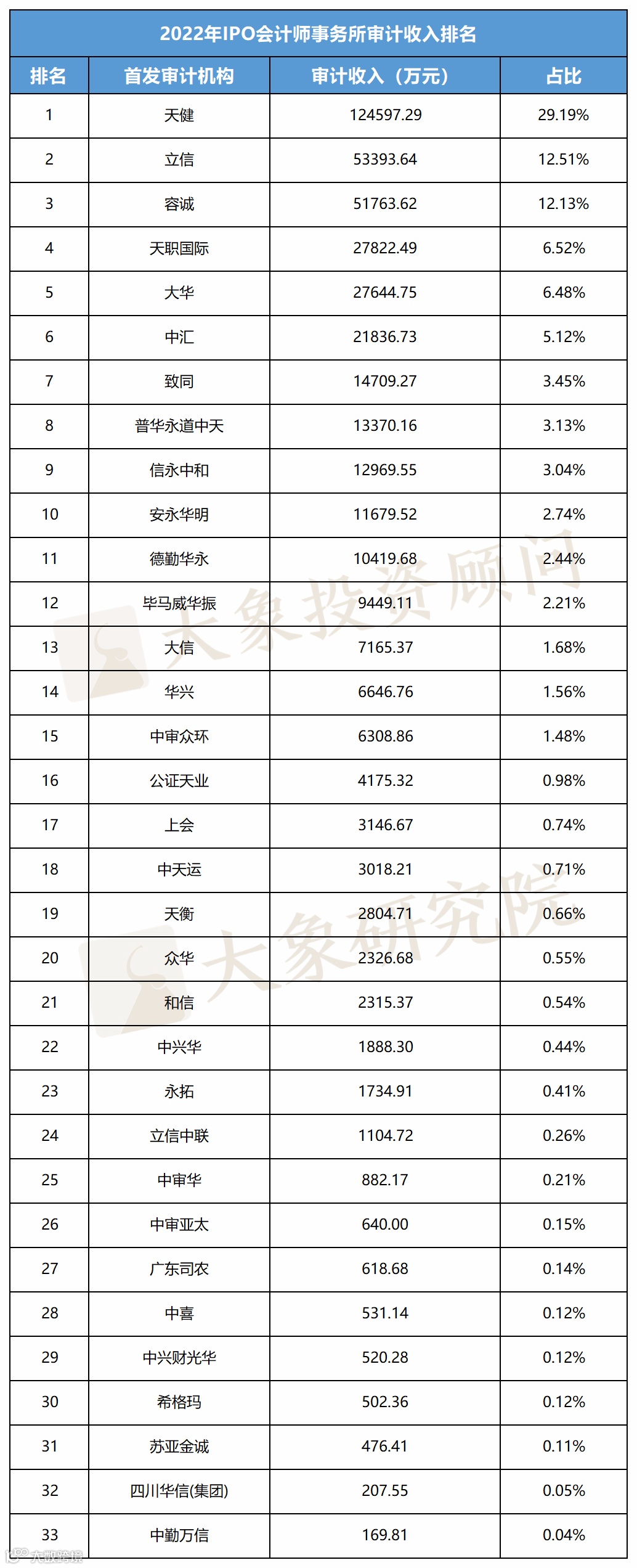 据统计,2022年有33家会计师事务所担任了IPO上市企业的审计机构。