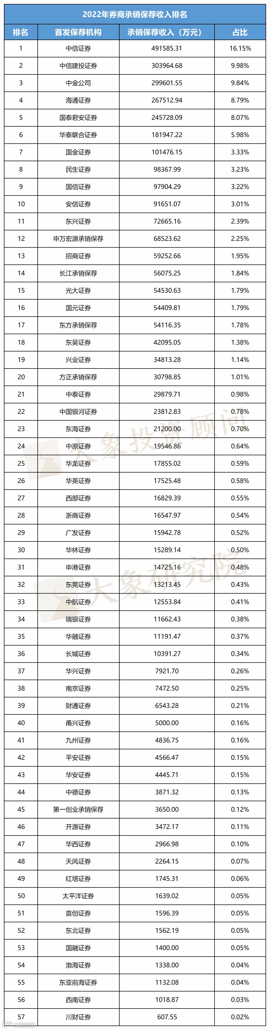 据统计,2022年,共有57家券商投行担任了IPO上市企业的保荐机构。