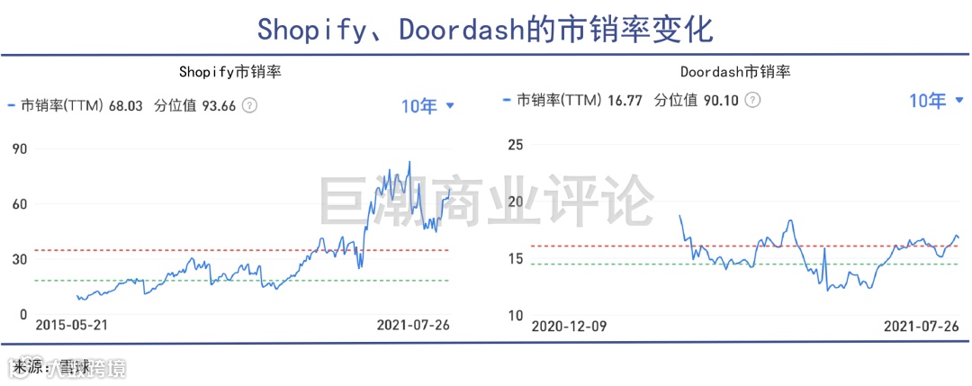 北美第二大电商公司、有创新的SaaS商业模式的Shopify,目前市值已经2044亿美元,合1.3万亿元,市盈率639倍,市销率70倍;