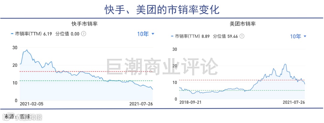观察两家公司的市销率就能发现,快手在26日正式跌破了发行价,市销率已经同步下降到6.19倍。美团的股价从最高460元开始一路下跌,距离腰斩一步之遥,市销率降至8.89倍。