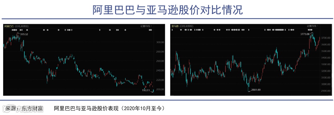 亚马逊有云计算,阿里巴巴也有;亚马逊有物流体系,阿里巴巴也有;亚马逊有国际业务,阿里巴巴还有。亚马逊的业绩在高速增长,阿里的增速也不低。但两家公司的市盈率差了一半还多。