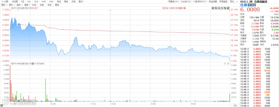 走势上,百果园集团开盘高开16.43%,随后短时间冲高至日内最高价7.12港元,最高上涨27.14%,但盘中上涨乏力,逐渐回落,最终仅收涨7.14%。