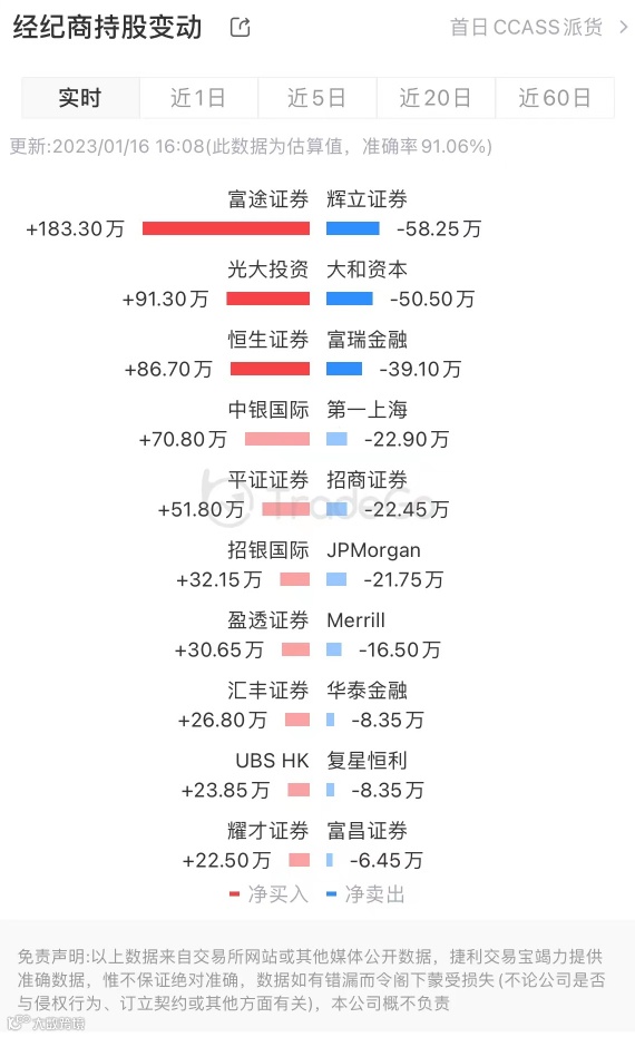 根据捷利交易宝APP-经纪商持股数据显示,上市首日最大的买入方为富途证券,净买入183.30万股股份,其次为光大投资,净买入91.30万股股份;最大的卖出方为辉立证券,净卖出58.25万股股份,其次为大和资本,净卖出50.50万股股份。