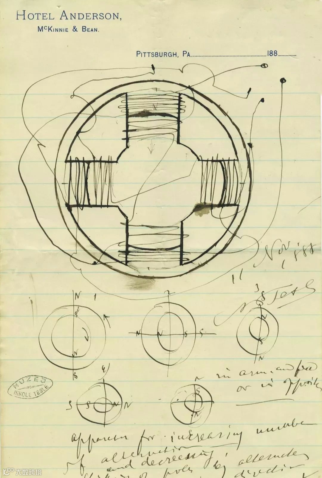 1888-1889年特斯拉在纽约居住的酒店的信纸上关于专利的设计图