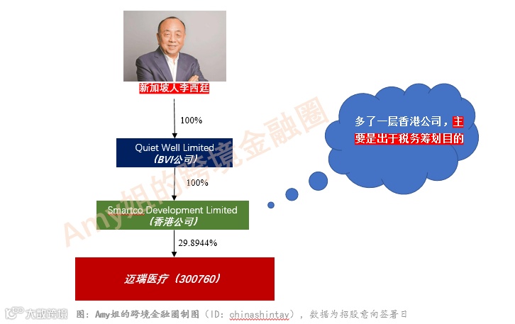 “新加坡人李西廷——避税天堂BVI公司——香港公司——国内迈瑞医疗公司股票”避税和资产安全架构搭成。