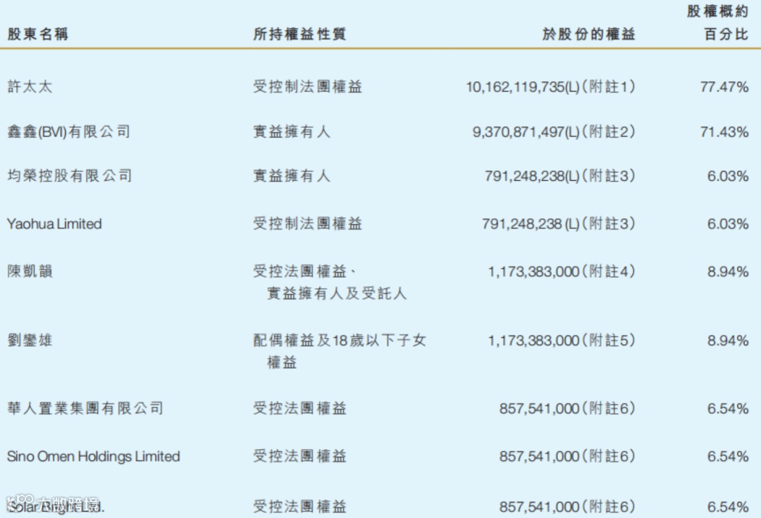 资料显示,华人置业集团有限公司的50.02%权益由Solar Bright Limited持有,该公司为陈凯韵全资持有的公司Sino Omen Holdings Limited的全资子公司。