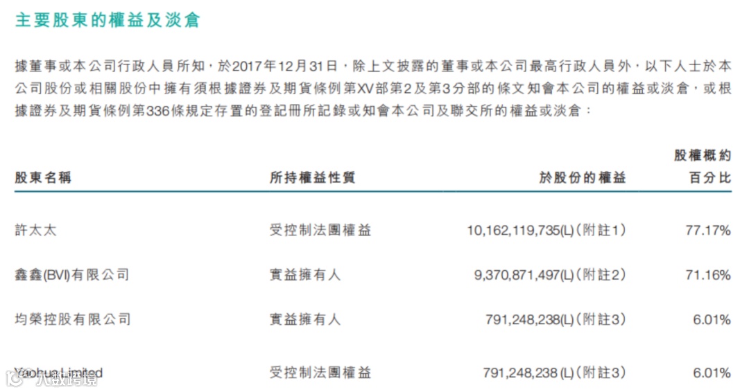 2016—2017年,根据年报披露,恒大的四大股东,主要由许家印的鑫鑫有限公司、丁玉梅的均荣控股有限公司、Yaohua Limited全资拥有,其中,Yaohua Limited由丁玉梅全资持有。在这两年间,中国恒大上市公司暂停了股息派付。