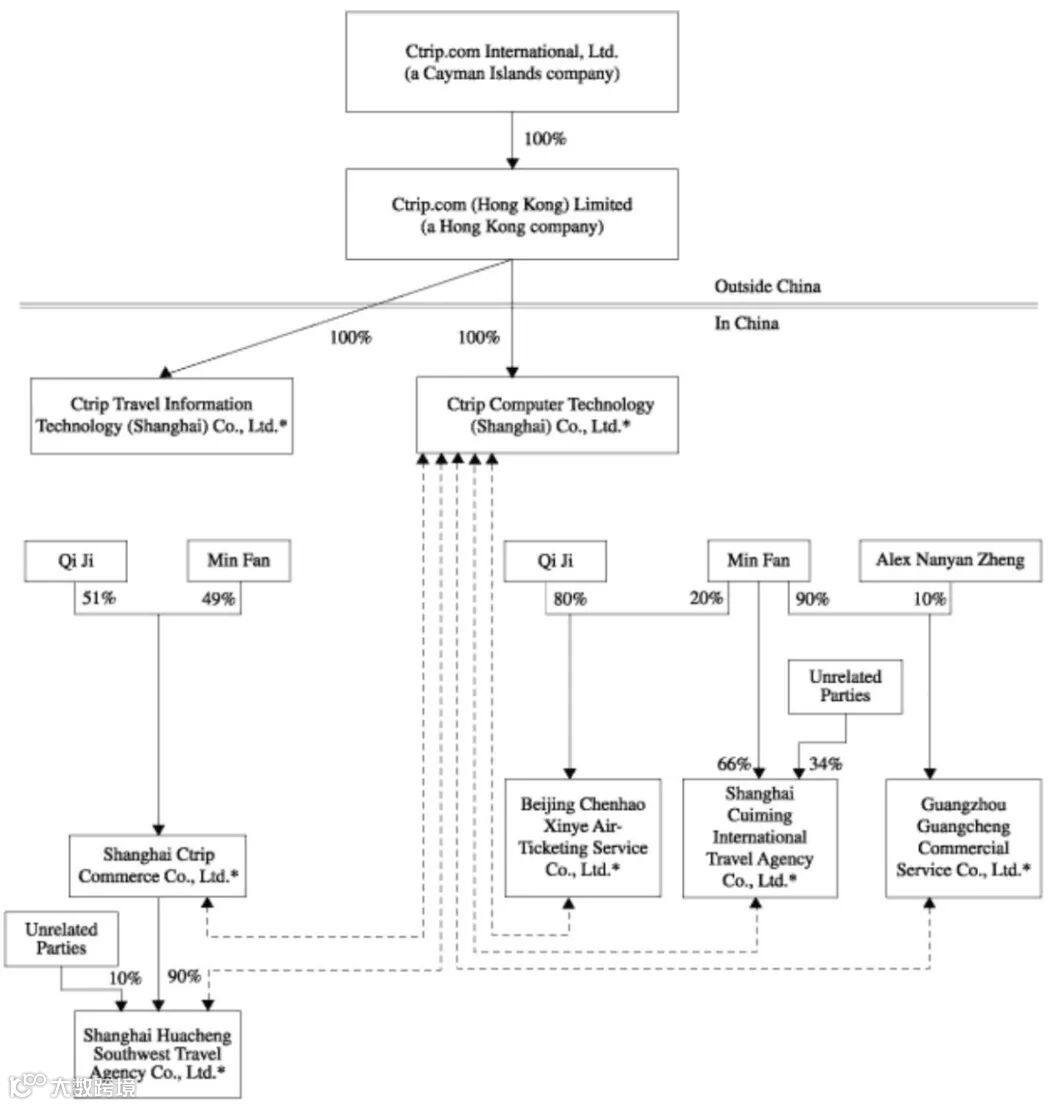 -2000年三大门户网站上市以后,“达康热”(Dot.com)崩盘,有两年多时间中概股无缘华尔街。其后,携程率先于2003年12月8日在纳斯达克上市,带出2004年的上市热潮。携程架构图的五条虚线,都是VIE公司。