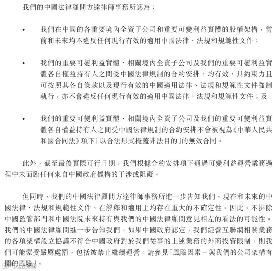 这些法律文字只在穷尽“风险提示”的义务,声明投资责任自负。看了都懂,但说了等于没说。其潜台词是“我们敬谨告知,VIE架构风险极大,你买我们股票,就表示你认知也同意接受这些风险。”