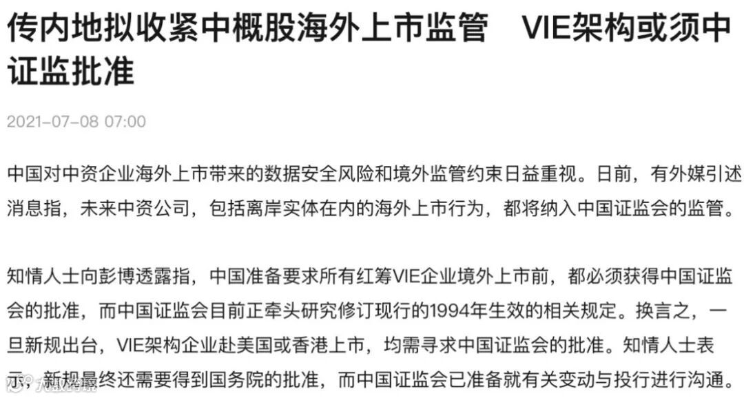 上述彭博社的报导,VIE企业未来在境外上市,须获证监会批准,在“存量管理”上,已上市的VIE企业,未来增发股票也须申报核准。该报导也提及,证监会正在牵头研究修订现行的1994年生效的相关规定。