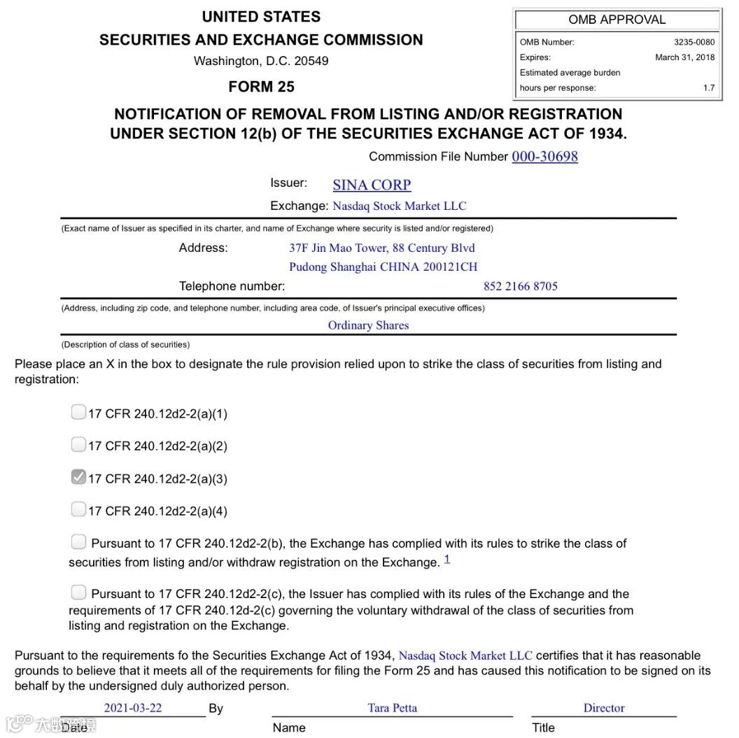 2020年7月,新浪启动私有化,提议以每股41美元现金收购发行在外的普通股。该收购要约于2020年12月,经股东会批准。新浪在纳斯达克的股票于2021年3月22日停止交易,完成退市。