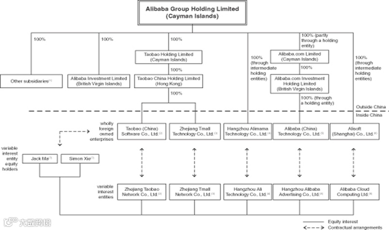 -阿里巴巴于2014年9月19日在纽交所上市,是当时世界最大的IPO項目。架构图里下方的五条垂直虚线,都是VIE公司 。