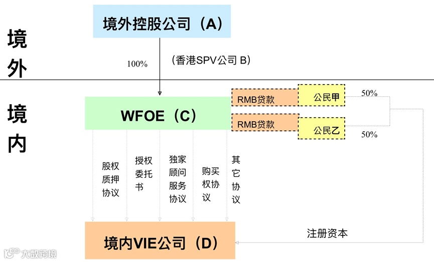 -有中国公民身份的创业者(自然人甲及乙),设立内资公司D,以取得所需执照,并据以经营及获得收入。