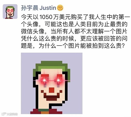 「加密朋克」的社区非常活跃,其中不乏各界名人,比如香港男演员余文乐、美图秀秀董事长蔡文胜等。波场币创始人孙宇晨在朋友圈表示,其以1050万美元购买了「人类目前为止最贵的微信头像」。