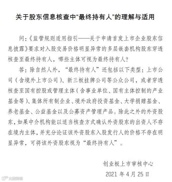 4、《监管规则适用指引—关于申请首发上市企业股东信息披露》由证监会发布,可以预计证监会审核IPO的股东穿透标准,后续也会出台同样的政策;