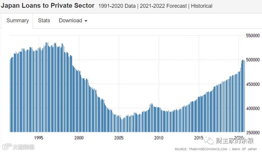 到了2020的时候,日本央行的印钞量接近700万亿日元,经过2013年以来的“高速增长”,目前留在日本企业和老百姓手里的钱,终于再次接近500万亿日元。