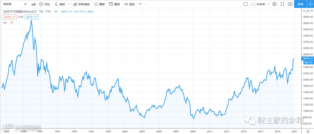 从股市来看,1990年的日本股市,日经225指数虽然经过了下跌,但依然在3万点以上。现在的日经225指数,虽然经过了连续大涨,创出了1991年以来的最高价,但指数还是不到2.7万点。