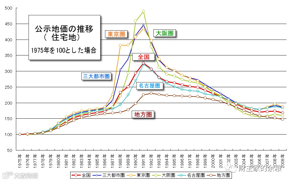 从日本三大都市圈(东京、大阪、名古屋)的房价指数来看,1975年如果是100的话,1990年在440左右,而2020年只有205左右。