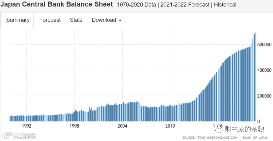 相比之下,我们来看一下日本央行自1990年以来骇人的印钞情况。
