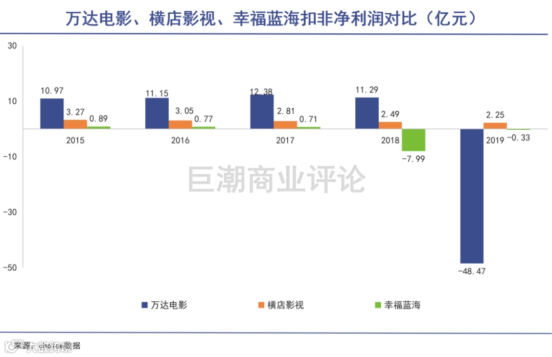 其中万达院线扣非净利润出现了8.95%的负增长,横店影视出现11.50%的负增长,幸福蓝海更是直接出现净利润为正、扣非净利润亏损的局面。