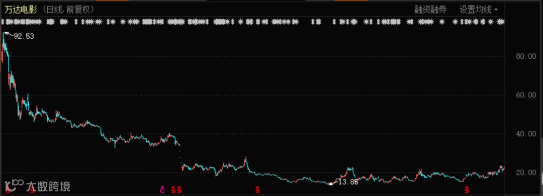 头部企业万达电影(SZ:002739)自2015年12月21日创出92.53元股价、市值2000多亿元的天价后,就开始了连续不断的下跌,最大跌幅超过了80%;