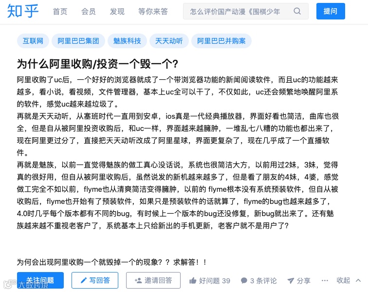 它还并非时运不济,而是几乎一直如此。知乎早有这样的提问:为什么阿里收购/投资一个毁一个?