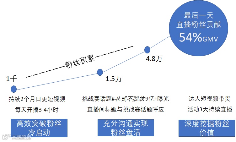 之后,发起#花式不脱妆#超级挑战赛,期间直播间标题与挑战赛话题呼应,迅速带来3倍粉丝增长。