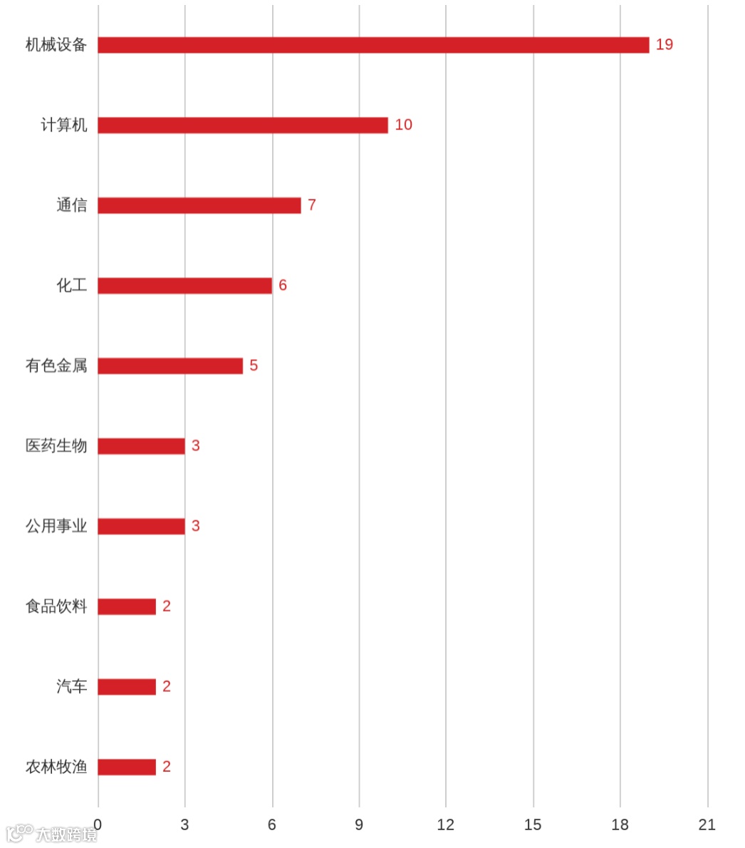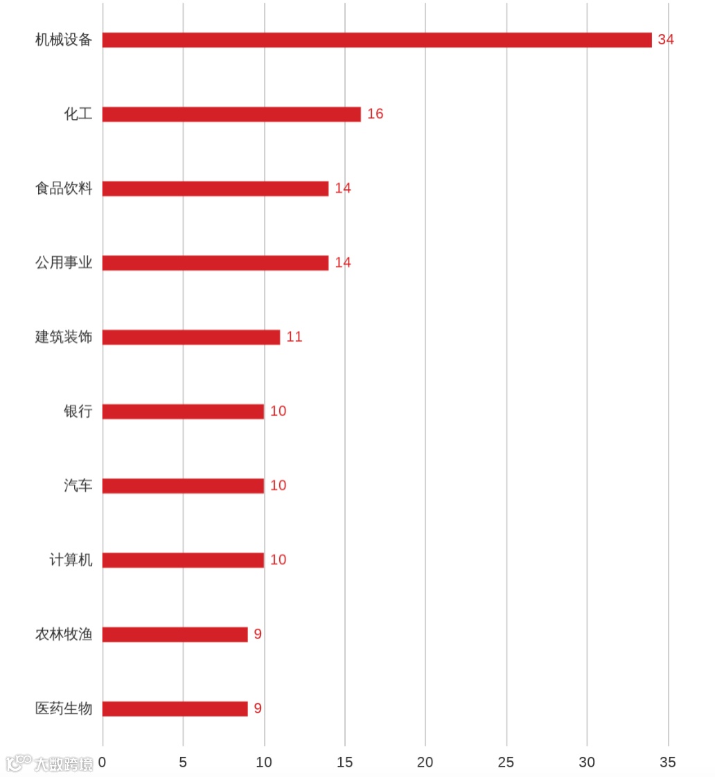 据证监会网站最新数据显示,已经信息披露的223家企业涉及28个行业。其中,排在第一位的是机械设备,共计34家企业,化工排在第二位,共计16家,第三位的是食品饮料,共计14家。