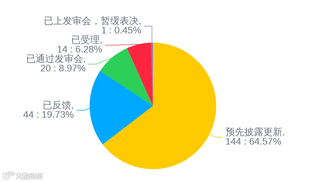 据证监会网站最新数据显示,截止目前,占比最高的是预先披露更新,共计144家,占比64.57%;其次是,已反馈企业44家,占比19.73%。