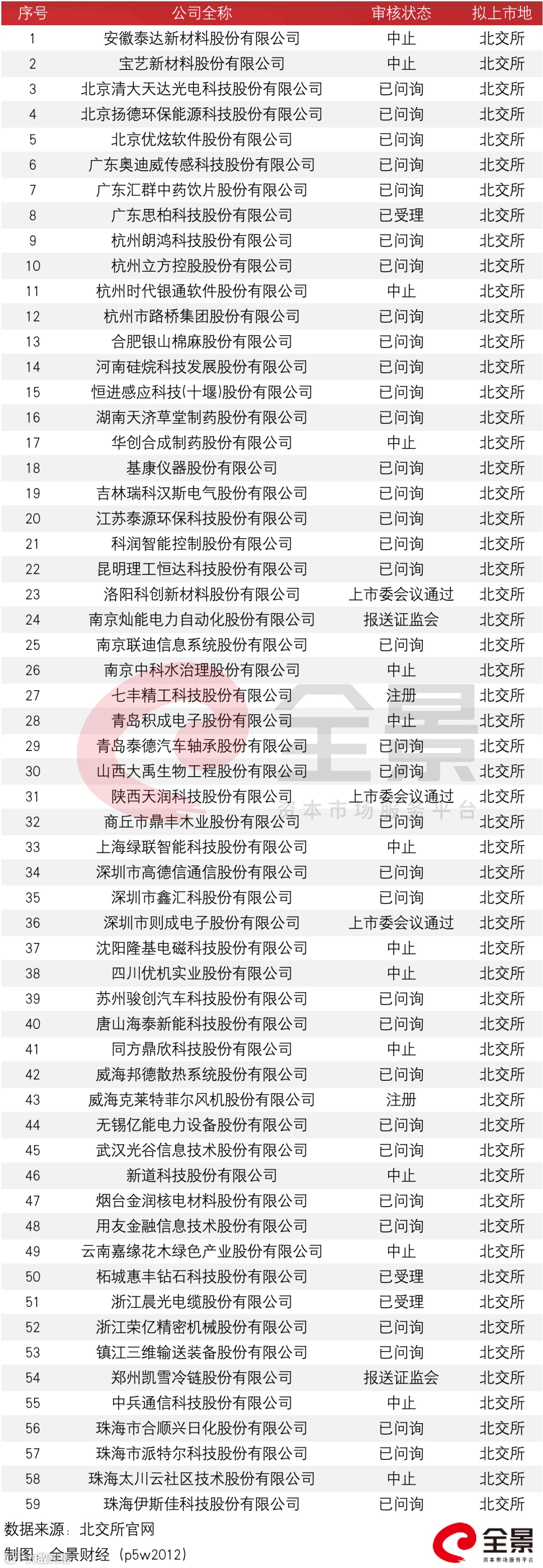 据北交所网站公开数据显示,截止3月18日,累计已有59家企业申报北交所首发上市申请,包括:已问询35家,中止14家,注册2家,上市委会议通过3家,已受理3家,报送证监会2家。