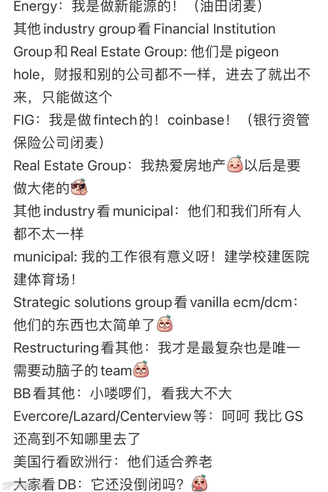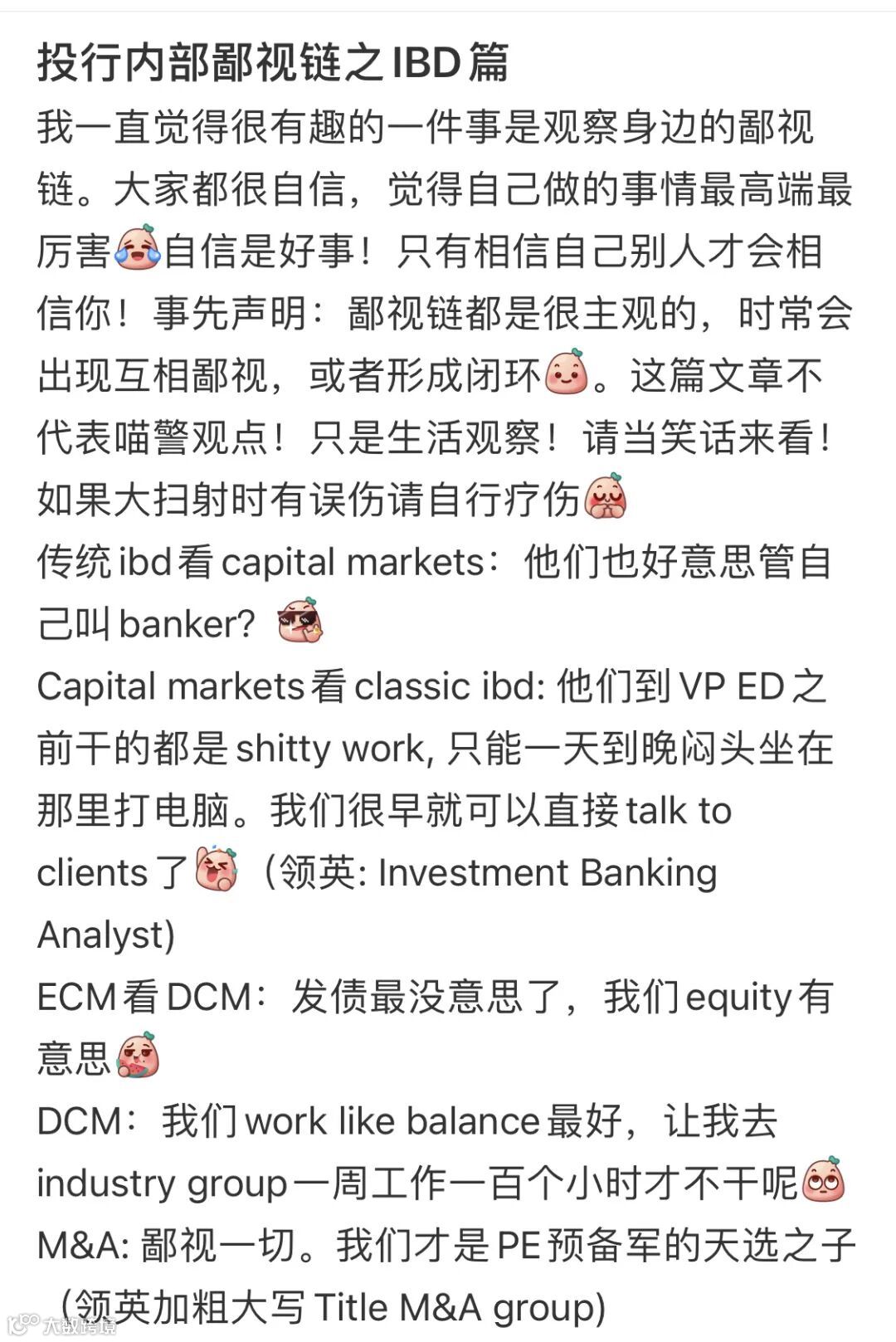 但华尔街人永不止步,小红书最近又火了一篇投行IBD内部的鄙视链,把IBD的各个组都盘了一遍,最后暗戳戳踩了一脚德银。