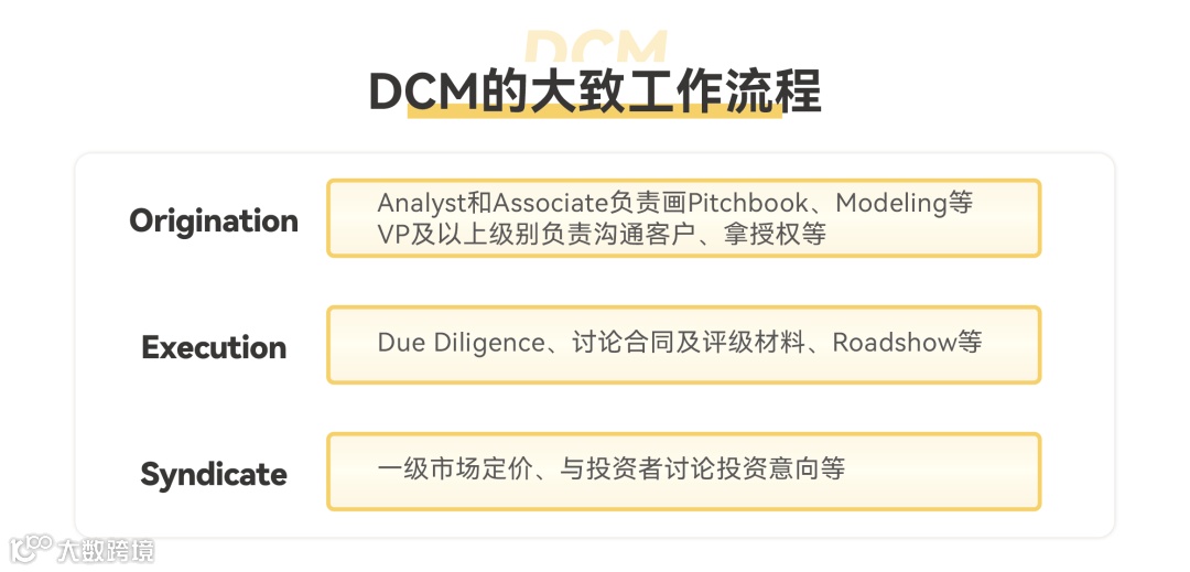 投行的DCM团队通常是通过将新债券发行在一级市场,来为公司或者政府部门筹集资金,一般初级的Analyst也是负责画Pitchbook和建模等工作。